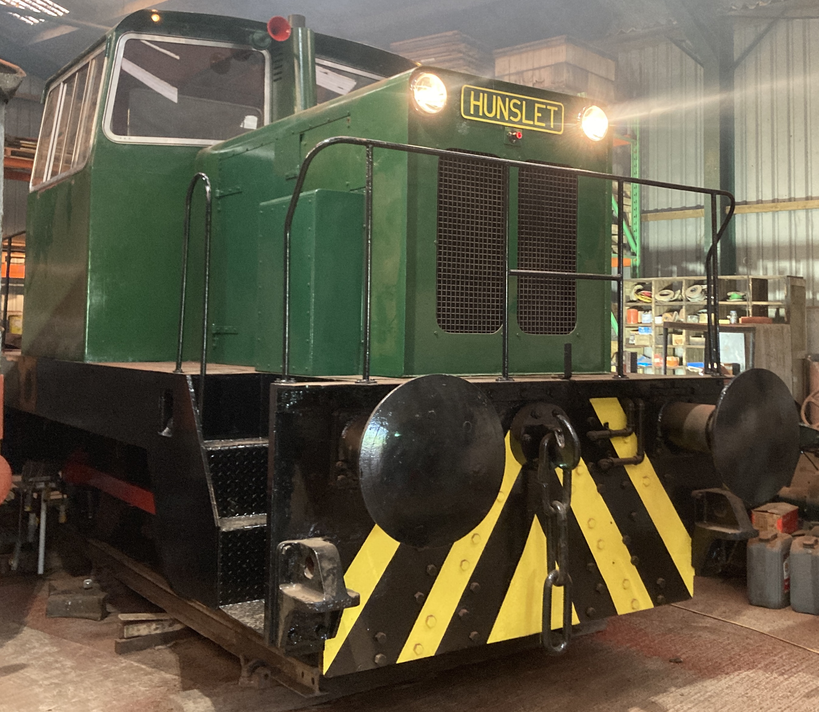 The Duke of Edinburgh has currently completed its restoration and repainted back to original colours of Brunswick Green (ex works) as delivered to Lever Brothers at Port Sunlight on 05th June 1956. As part of the restoration the buffer beam (originally painted red as Image 1, later red and white chevrons as image 5) has been replaced with yellow and black wasps).